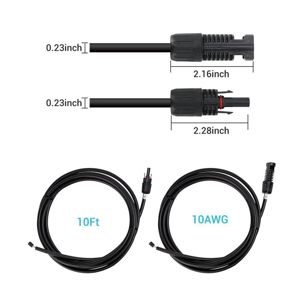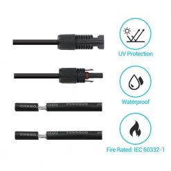 The Renogy Adaptor Kit is a set of two wires designed specifically for connecting a Renogy solar panel to a charge controller. The Adaptor Kit includes solar connectors on one end for effortless connection to the solar panel, and exposed wire on the other end to lead directly into the charge controller. This wiring kit is essential for off-grid solar installations, roof or ground level, and is offered in a wide range of sizes. The wiring is weatherproof and designed to withstand extreme heat and cold. This wiring kit is ideal for Renogy Off-Grid Kits ranging from 100W to 400W. Renogy offers a wide range of lengths, as well as two different gauge sizes to choose from. The different sizes allow for customization based on a customer’s unique needs. The Renogy 10ft 10AWG Adaptor Kit allows for 10 feet of length between the solar panel and charge controller.