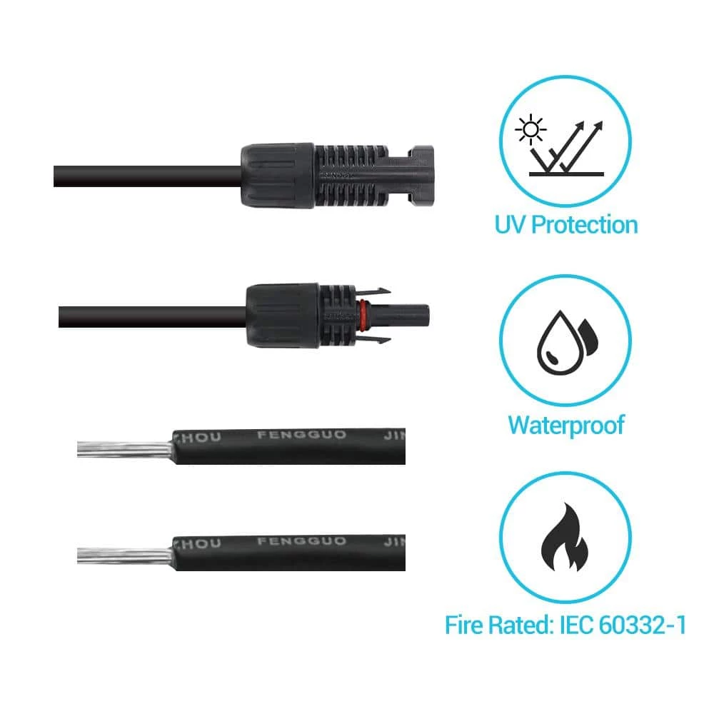 The Renogy Adaptor Kit is a set of two wires designed specifically for connecting a Renogy solar panel to a charge controller. The Adaptor Kit includes solar connectors on one end for effortless connection to the solar panel, and exposed wire on the other end to lead directly into the charge controller. This wiring kit is essential for off-grid solar installations, roof or ground level, and is offered in a wide range of sizes. The wiring is weatherproof and designed to withstand extreme heat and cold. This wiring kit is ideal for Renogy Off-Grid Kits ranging from 100W to 400W. Renogy offers a wide range of lengths, as well as two different gauge sizes to choose from. The different sizes allow for customization based on a customer’s unique needs. The Renogy 10ft 12AWG Adaptor Kit allows for 10 feet of length between the solar panel and charge controller.