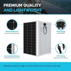 High in power, compact in size, this Renogy 100 Watt 12 Volt Monocrystalline Solar Panel is the perfect option for any off-grid application. Ideal for RVs, motorhomes, cabins, marine areas, home backup power, and more. The panels feature lightweight aluminum frames and shatter-resistant glass, making them perfect for outdoor applications.It comes with pre-drilled mounting holes, solar connector leads, and a junction box. Allowing you to install, connect it to a controller, or expand with panels without breaking a sweat. The panels are made of premium Grade A+ monocrystalline solar cells that are more efficient than conventional polycrystalline solar cells.Since 2010, Renogy has gained rich experience designing and manufacturing the most efficient and robust solar panels and complete off-grid solar systems. Renogy’s focus on testing, quality control, and traceability ensures our solar power system offers industry-leading reliability. Invest in yourself by going Renogy. Renogy solar panels will be your most economical long-term investment yet.