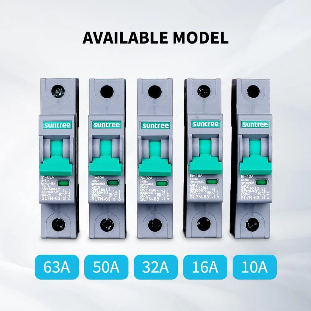 The Suntree DC Miniature Circuit Breaker is designed to protect DC electrical installations against overloads and short circuits with both the thermal and magnetic tripping mechanism equipped. Once a fault is detected, the circuit breaker automatically switches off the electrical circuit to prevent damage to wires and avoid the risk of fire. The circuit breaker can also be manually opened under the full rated load without any damage when electrical maintenance needs to be performed. Engineered for reversible connection, the circuit breaker is allowed to be wired in either direction and functions under bidirectional current. The built-in indicator window helps identify the contact position of the circuit breaker at a glance. The buckle design enables easy installation on the standard DIN rail.