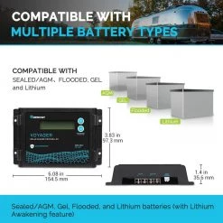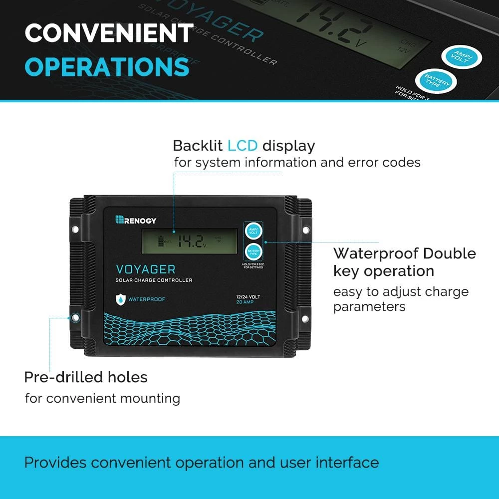 Featuring a bright blue back-lit LCD displaying system information including error codes, the Voyager is engineered to be of world-class quality. Not only is it waterproof, but it is also equipped with advanced PWM technology suitable for 12-Volt and 24-Volt off-grid applications, and compatible with 4 different battery types, including Lithium Ensure your system’s longevity and stay worry-free as the Voyager also has you covered with multiple solar panel, battery, and controller protections. If you have any questions regarding this product.