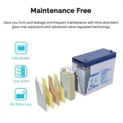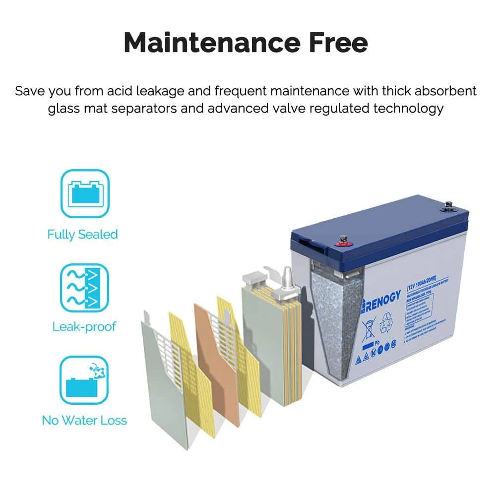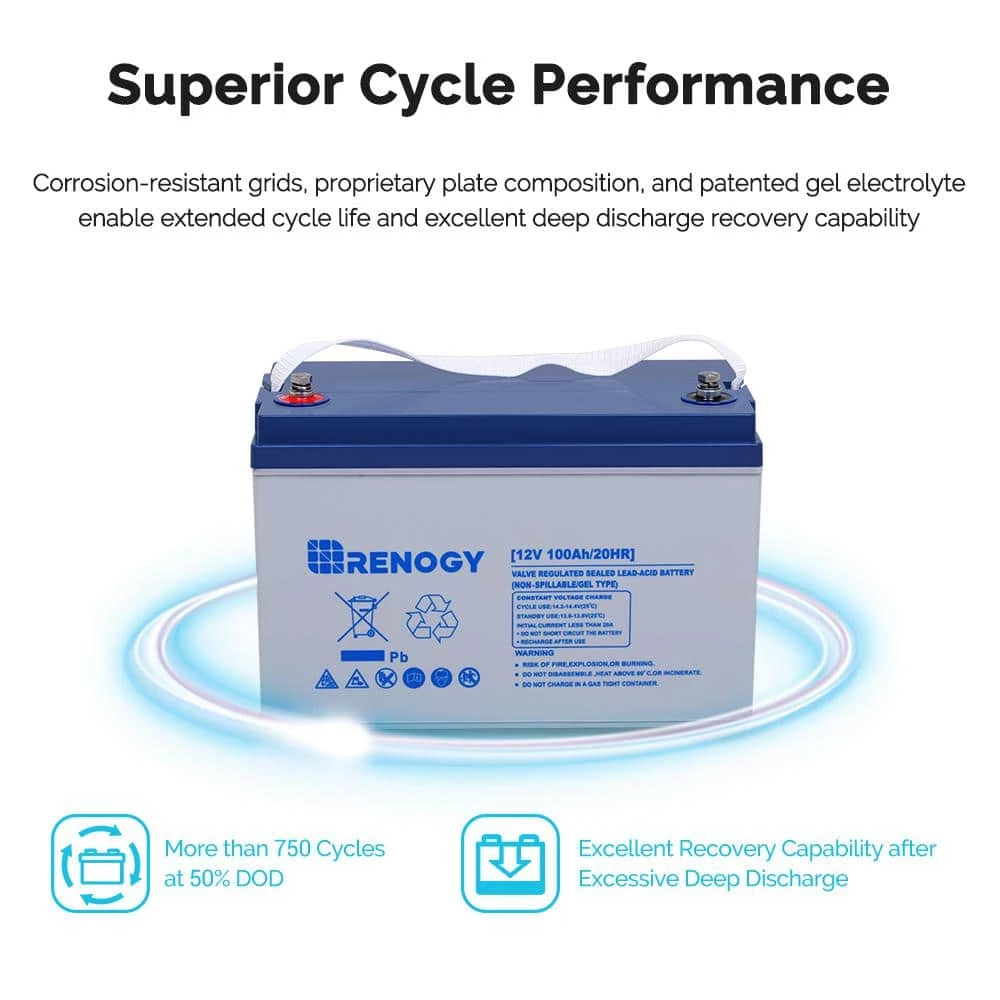- Maintenance-free manufactured with gel suspended electrolyte and Advanced Valve regulated technology, Renogy deep cycle hybrid gel batteries save you from acid leakage and frequent maintenance
