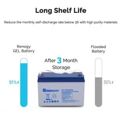- Long-shelf life made of high purity materials, Renogy deep cycle hybrid gel batteries reduce the monthly self-discharge rate below 3% at 77 (25), which is 5-times lower than their flooded counterparts