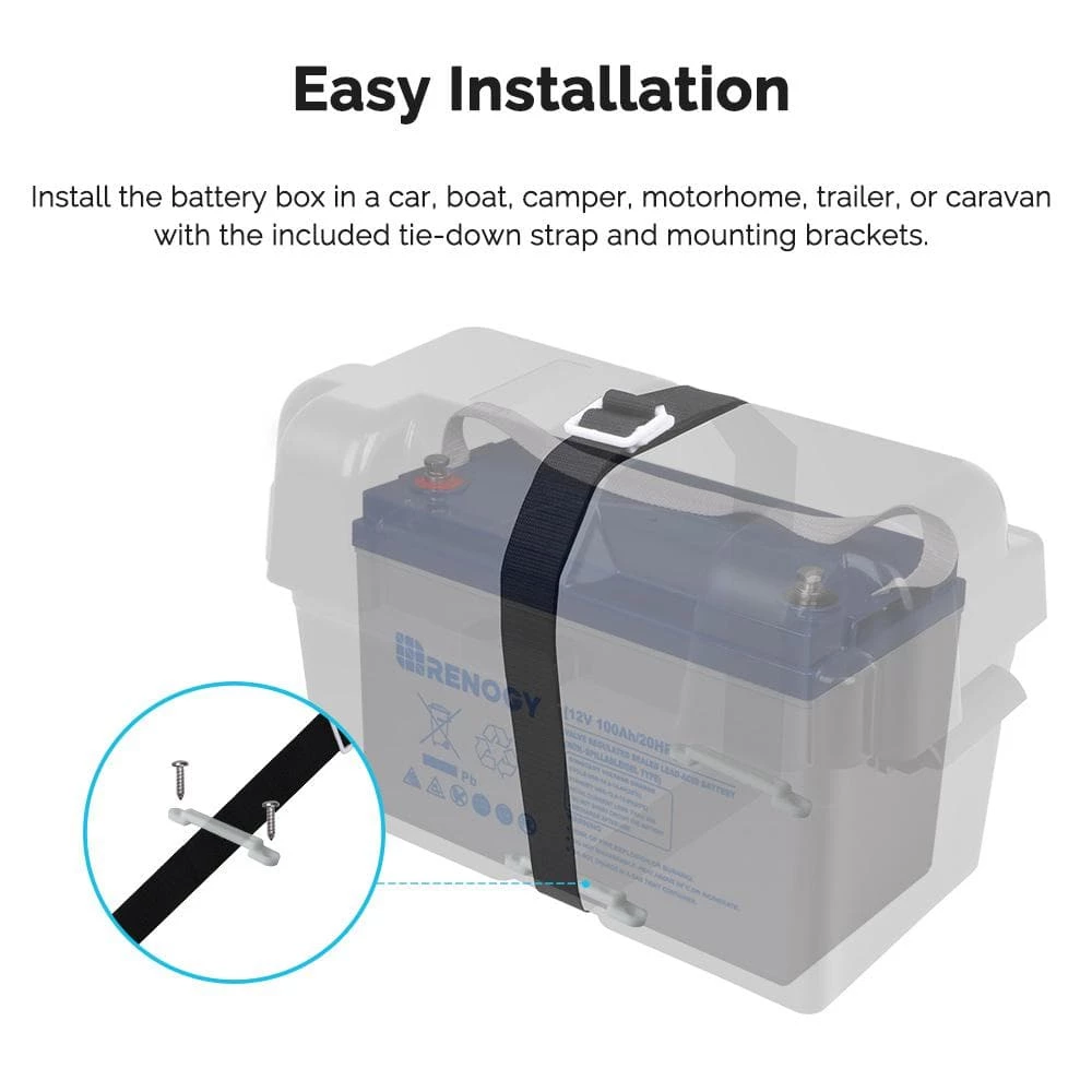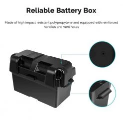 - Rugged battery box made with high impact-resistant material to withstand harsh environments, the heavy-duty battery box provides comprehensive protections for the Renogy deep cycle battery, including reinforced handles to prevent cracking during battery relocation and vent holes for adequate battery ventilation