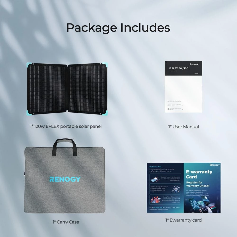 - What you get 1*Renogy 120-Watt solar panel 1*Waterproof bag 1*User guide 1* warranty card