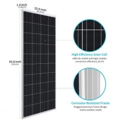 - 【Max Power at STC: 200W】【Open Circuit Voltage: 27 V】【Short Circuit Current: 9.66 A】【Optimum Operating Voltage: 22.6 V】【Optimum Operating Current: 8.85 A】【Operating Temperature: -40°F to 194°F】【Dimensions: 64.96 x 26.38 x 1.38 in】【Weight: 26.46 lb】【Solar Cells: 40 Cells】【Cables: 14 AWG 2.95 ft】【Junction Box: IP65】【Connectors: Solar Connectors】【Module Efficiency: 8.1%】【Maximum System Voltage: 600 VDC UL】【Maximum Series Fuse Rating: 15A】【Cell dimension: (6.25 x 6.25) in x 40 cells】