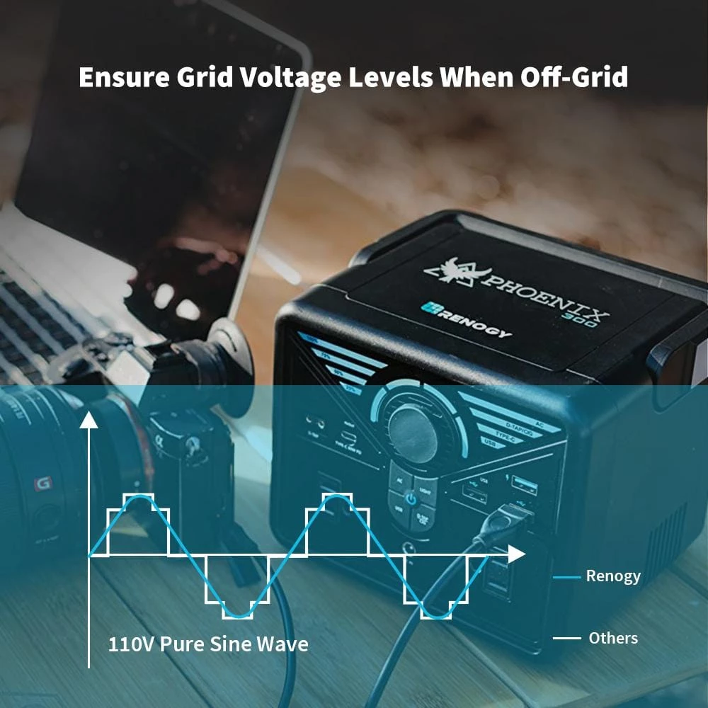- The Phoenix features two 120V AC outputs (pure sine wave) and can power most devices below 300W; For optimal recharging, it is strongly recommended to recharge your Phoenix 300 with a compatible solar panel (not included), placing panel under direct sunlight; included MC4 to 5.5mm DC adapter cord can link panel to DC input port of the Phoenix; Please note that the solar panel must meet the following specifications: open circuit voltage between 12V-25V, Max.120W (final input solar power) if Voltage is below 12V or above 25V low-voltage / over-voltage protection will be triggered