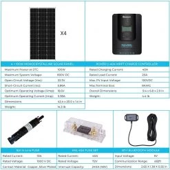 The Renogy 400W 12V Premium Kit is easy for you to install, and it is the most economical choice for the off-grid adventurer. Renogy Solar Kit comes with solar panels, charge controllers, and needed electrical wiring, fuses, and monitoring typically required for an off-grid installation, making it an ideal choice for both off-grid and mobile solar power applications. The Premium Kit will produce an average of 1.6-2.5kWh of electricity per day (depending on sun availability). The 4 x 100W solar panels don’t take up much roof space, but the energy they produce can offset small and medium-size loads such as lighting, television, and kitchen appliances. The Premium Kit can build a reliable and environmentally friendly power supply, perfect for all rooftops, RVs, boats, or campers. It can also be installed in a ground mount system, as a power supply for outdoor appliances, emergencies, and a stand-alone power system.