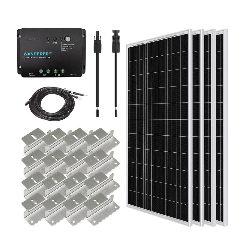 Renogy Solar Kits can be used for several different purposes, from trickle charging batteries to acting as an emergency power backup system. Whatever the kit is used for, you can rest assured that you are purchasing a quality system. The Renogy 400W Monocrystalline Starter Kit was created for customers new to solar, or for those looking to expand on an existing power system. The Starter Kit is also ideal for several off-grid applications, including RVs, trailers, boats, sheds, and cabins – providing many benefits, including, but not limited to, quiet power production and grid independence. This kit comes with the tools necessary for a new system: four Renogy 100W 12V Monocrystalline Solar Panels, one 30A PWM Wanderer Li Charge Controller, one 20ft 10AWG Adaptor Kit, one 8ft 10AWG Tray Cable, three pairs of branch connectors, and four sets of Z-brackets. Add convenience and peace of mind to your next journey with a Renogy Starter Kit.