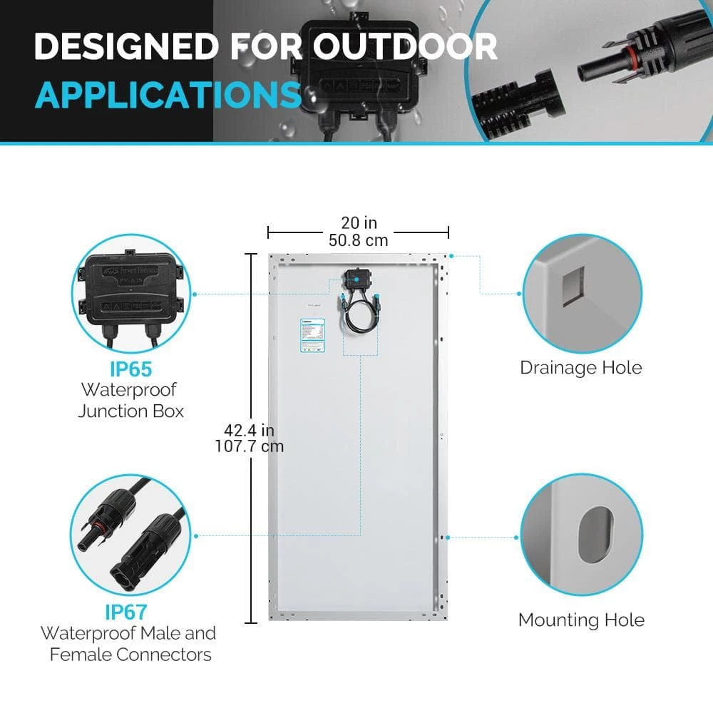 - Monocrystalline solar cell efficiency: 21%ï¼›Ideal output: 2000Wh per day; can fully charge a 200Ah battery from 50% in 3 hours (depending on the availability of sunlight).