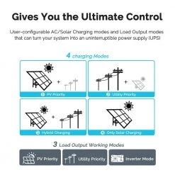 - 4 charging modes: PV priority, utility priority, hybrid charging, and solar only, 3 load output modes: PV priority, utility priority, and inverter only