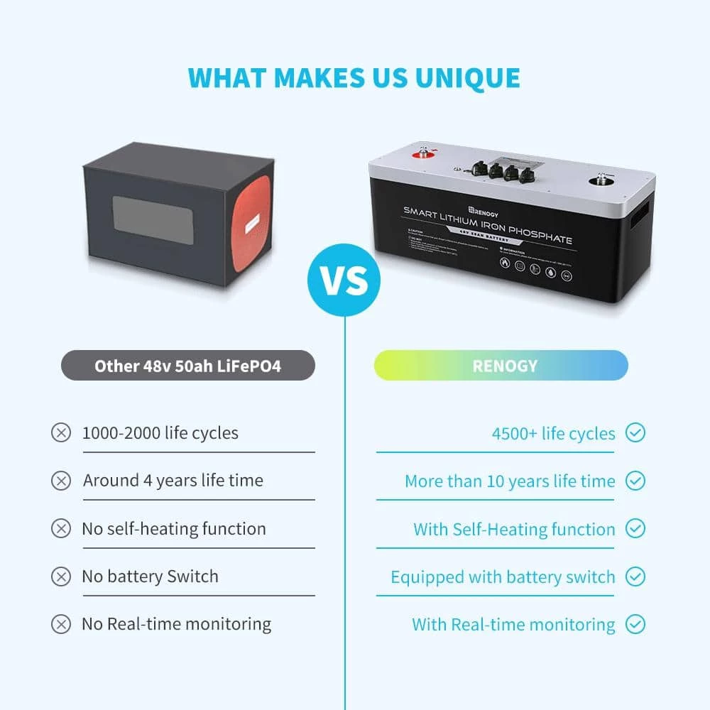 - Uncompromising Quality: Renogy’s latest 48V battery delivers a breakthrough in quality by offering an exceptional lifespan of more than 4500 cycles (reducing to 80% capacity after 4500 cycles), a 50A maximum discharge current, and most importantly, an extensive five year warranty.