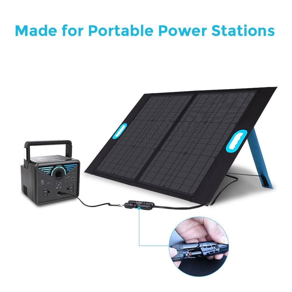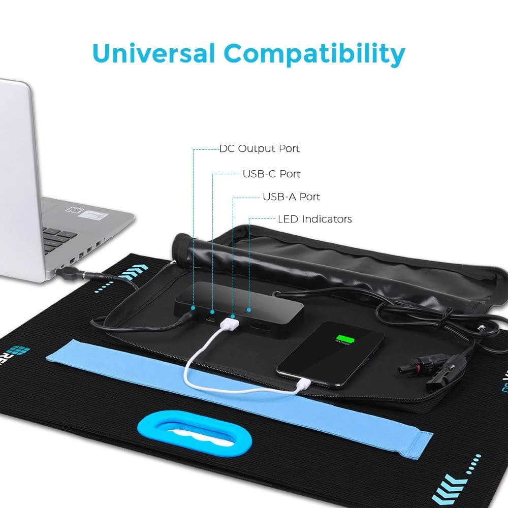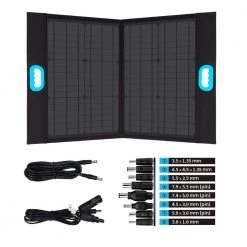 - Specifications: solar panel: Rated power: 50W Optimum operating voltage: 18V Optimum operating current: 2.77A Open circuit voltage: 21.6V Short circuit current: 3.04A Solar cell: monocrystalline Output: DC Output port: 19V / 2.4A, 16V / 2.8A Max USB-A port: 5V / 2.4A Max USB-C port: 5V / 3A Max Solar panel connectors: 18V / 2.77A Max General: Weight: 5.25 lbs. Dimensions: (Folded): 19.9 x 16.1 x 0.8 in. Dimensions: (Unfolded): 32.5 x 19.9 x 0.2 in.
