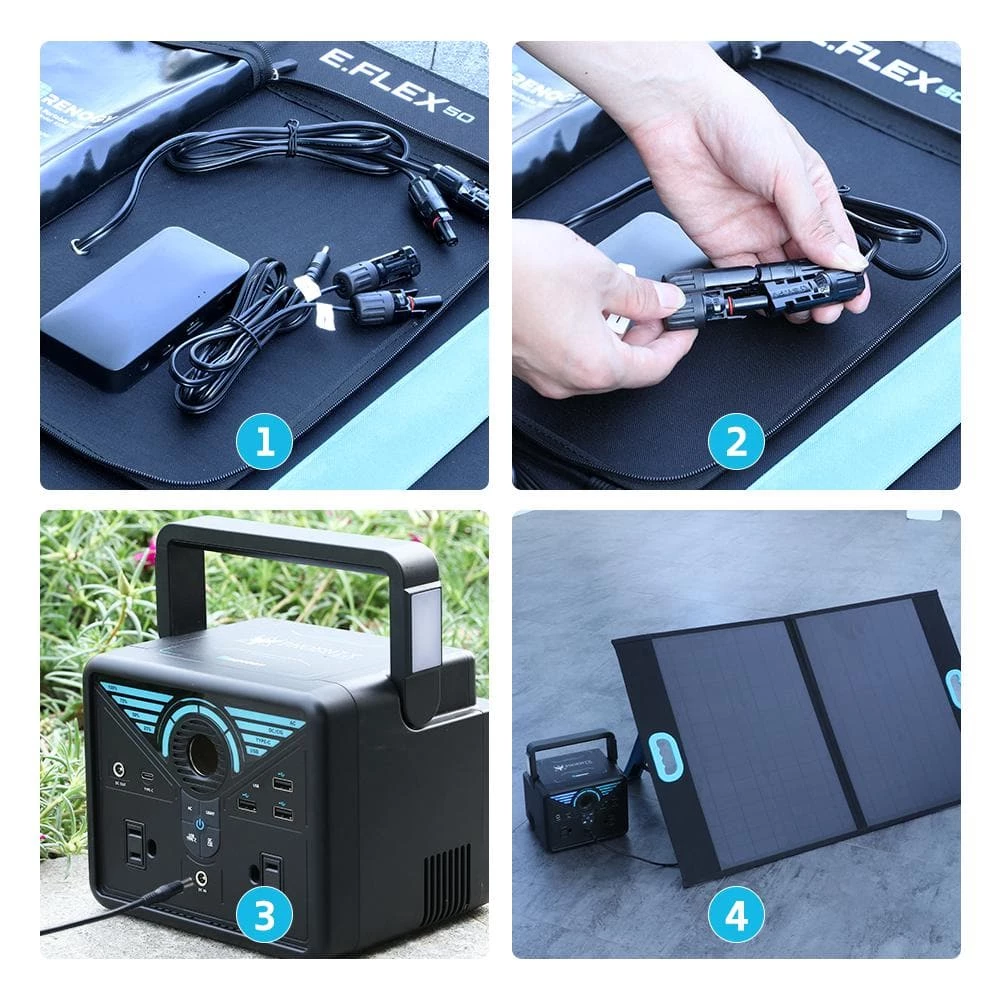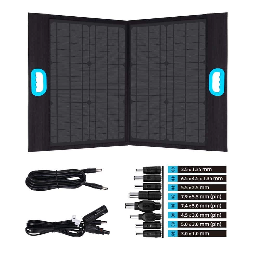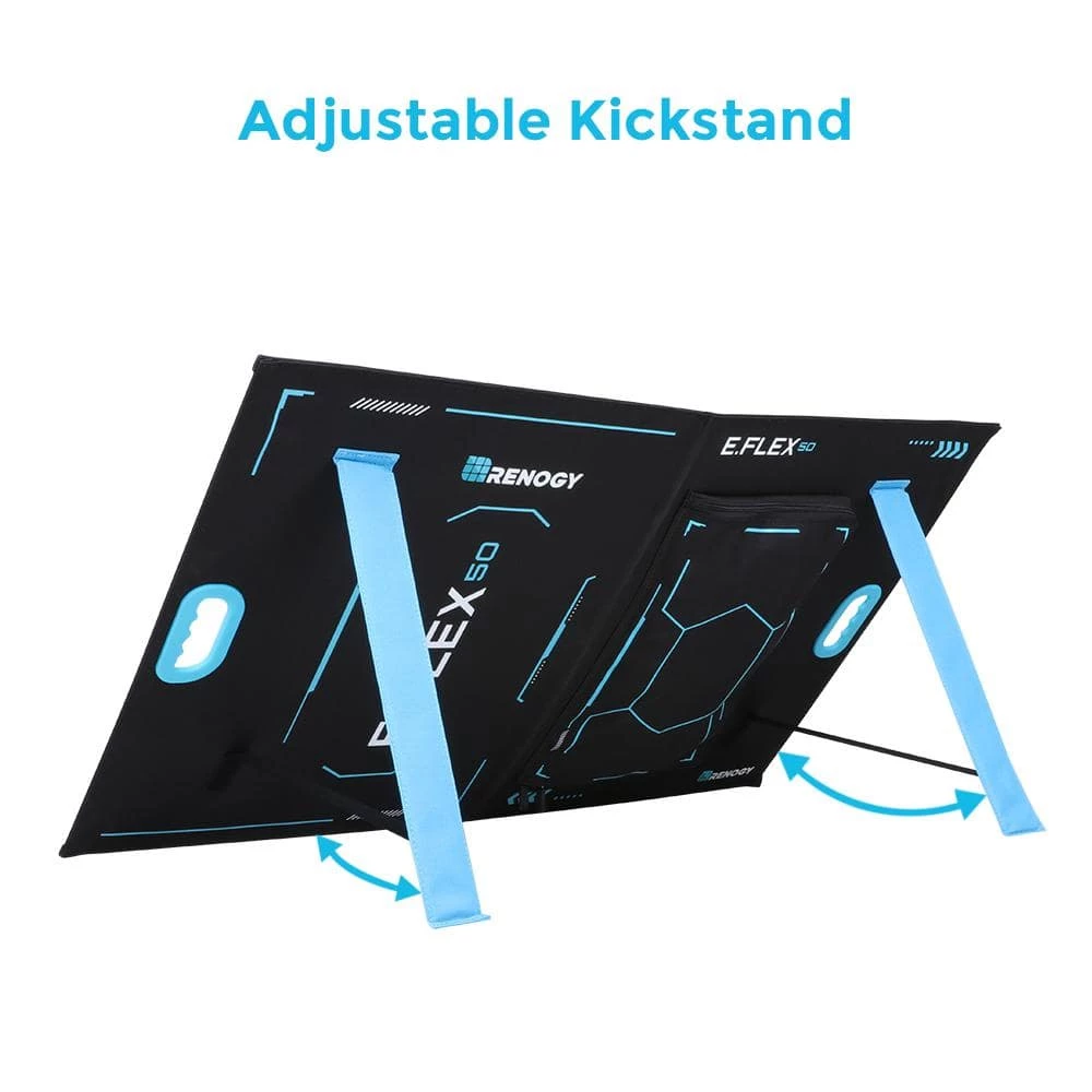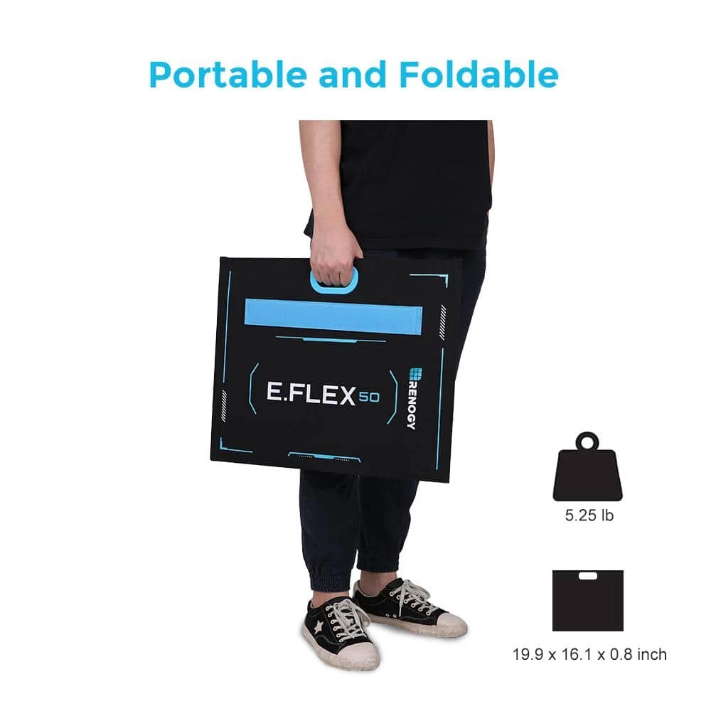 - Package Content: (1) Renogy E.FLEX 50 portable solar panel (1) solar panel connector to 5.5mm DC adapter cable (1) 5.5mm DC to 5.5mm DC power cable (8) 5.5mm DC adapter connectors (1)user guide