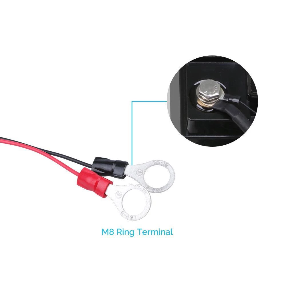 - Plug in the connector to your charge controller and connect the ring terminals to your battery bank