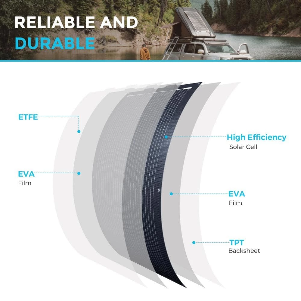 - Easy to transport, carry and install, the solar panel suits most curved surfaces as it is bendable within 240°, it weighs only 1/3 of the rigid panel and presents an all-black glare-free appearance