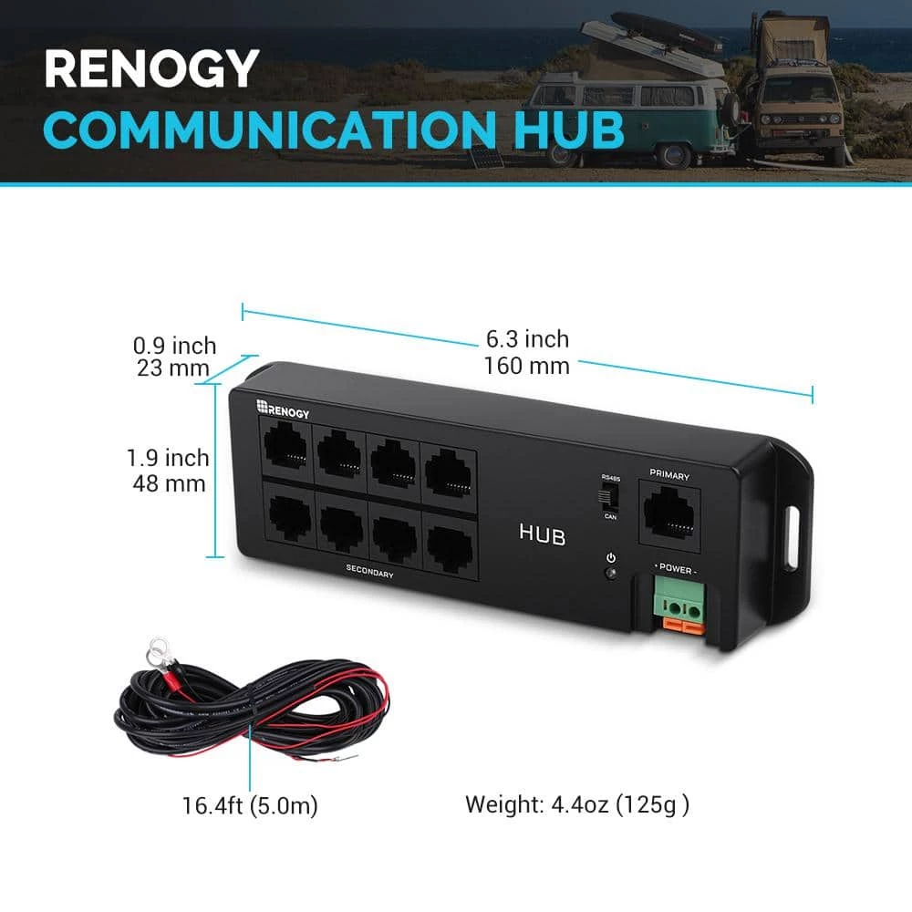 The Renogy Communication Hub allows you to connect multiple Renogy appliances with an RJ45 port and RS485 communication protocol to just one BT-2 Bluetooth module. Now you can use your phone to monitor multiple devices at the same time. The Renogy Communication Hub also supports both RS485 and CAN communication protocols – giving you a wider selection of compatible devices.