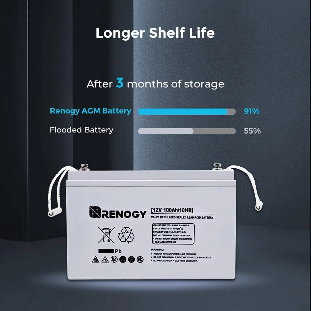 - 【Longer Shelf Life】Made of high purity materials, Renogy Deep Cycle AGM Batteries reduce the monthly self-discharge rate below 3% at 77℉ (25℃), which is 5 times lower than their flooded counterparts. No need to recharge the battery frequently when not in use.