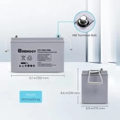Due to its outstanding performance, the Renogy 12V Deep Cycle AGM Battery is a favorite in a wide variety of applications. Maintenance-free and leak-proof, the battery is ideal for standby projects that require minimal monitoring. Thanks to its high discharge rate and wide operation temperature range, the battery can also handle cyclic uses, such as RVs, boats, medical equipment, and lawnmowers. With the finest materials, state-of-the-art production techniques, and the strictest quality control measures, Renogy AGM batteries aim to provide the most reliable, convenient, and economical rechargeable battery solution.Need a little more power? Connect several batteries in a series or parallel (up to 4) battery bank with Renogy Battery Interconnect Cables.NOTE:● To avoid cycle life shortening, it is recommended not to discharge the battery below 50%.● It is highly recommended to use a battery balancer to extend the battery service life when multiple batteries are connected in series and/or in parallel.● We highly recommend installing the battery upright. It is allowed to install the battery on its side only if there are special reasons for doing so. DO NOT install the battery upside down.● It is recommended to connect batteries with the same type (AGM), same voltage (V), and same capacity (Ah) from the same brand.