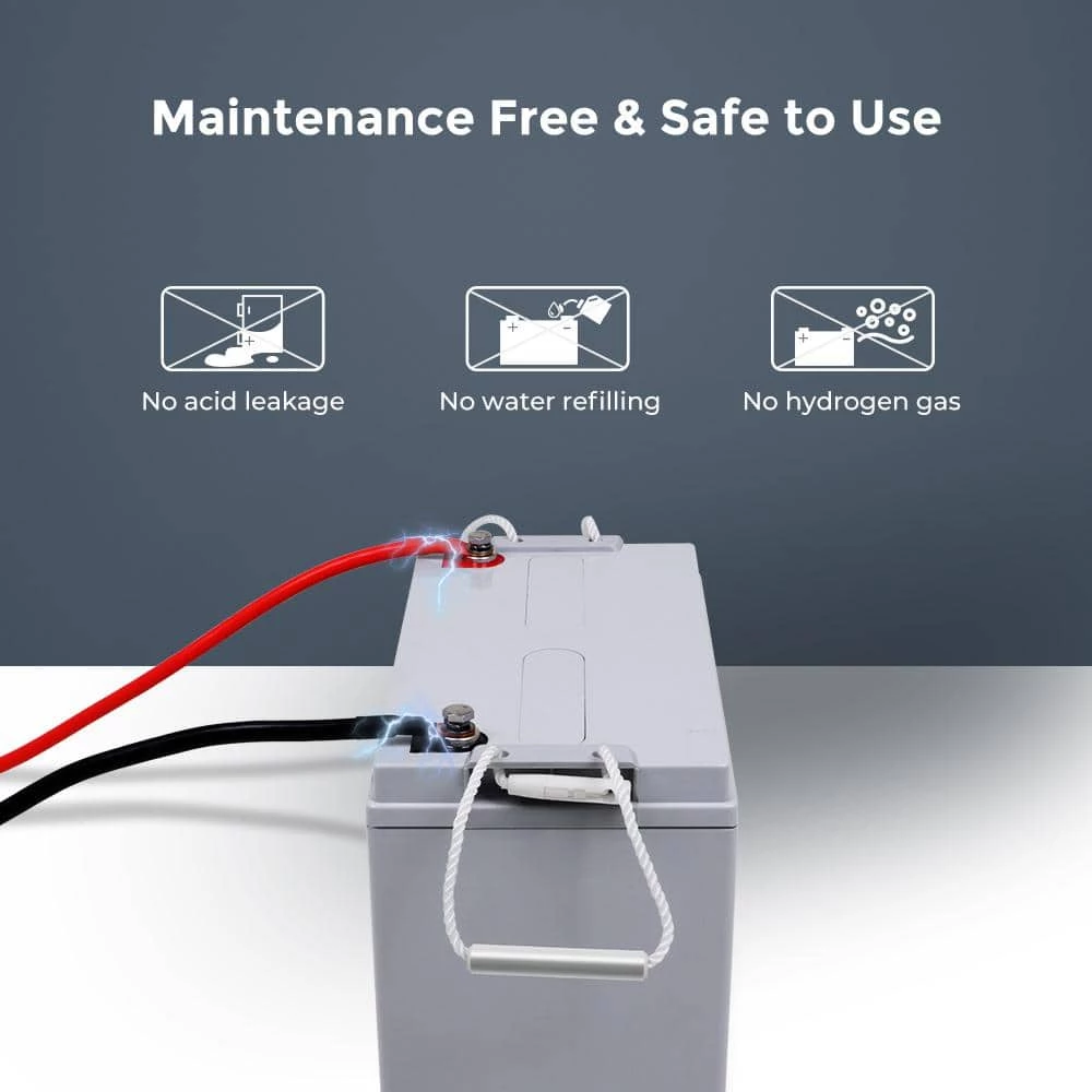 - 【Maintenance Free & Safe to Use】Manufactured with thick absorbent glass mat (AGM) separators and advanced valve regulated technology, Renogy Deep Cycle AGM Batteries save you from acid leakage and frequent maintenance. No acid leakage, no water refilling, and no harmful hydrogen gas.