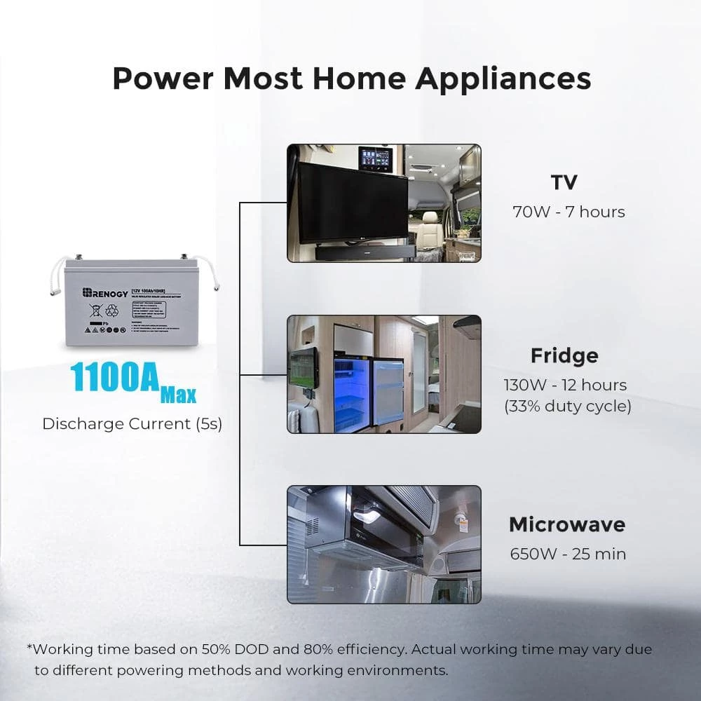 - 【Power Most Appliances】Featuring 1100A (5 seconds) max discharge current and consistent, stable discharge, the battery can power up most home appliances, such as a fridge, microwave, CPAP, coffee maker, laptop, and more.
