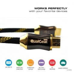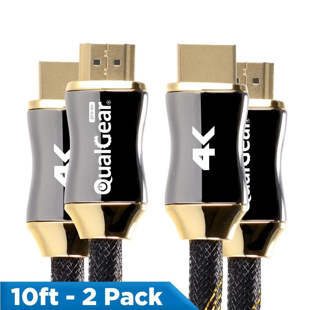 Enjoy high-quality picture and pure audio by implementing the QualGear 10 ft. premium certified HDMI cable of 2-pack with Ethernet in your AV setup. This cable is certified by HDMI.Org and rigorously tested to ensure quality for feature-rich 4K/Ultra HD content at blazing transfer speeds of 18Gbps or more (most HDMI cables in the market support transfer speeds up to 10.2Gbps). HDMI.Org tested this cable to ensure it meets their very strict EMI tolerance levels (Bluetooth, GSM and other radio / wireless signals cause electromagnetic interference which impacts audio quality). Additionally, HDMI.Org tested this cable to ensure it meets HDMI 2.0B specification and supports advanced HDMI capabilities (which are not available in HDMI 2.0 specification) such as BT.2020 and HDR (high dynamic range). This all-in-one video plus audio cable features 100% oxygen free copper (OFC), 28Awg thick bare copper for higher bandwidths to the full 18Gbps. This premium certified cable features zinc alloy connectors (act as EMI shield), 24K gold plated contacts for improved signal clarity. This cable features 2 color nylon braided sleeve for an elegant look and ultimate protection.