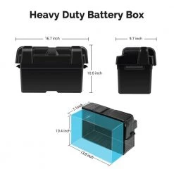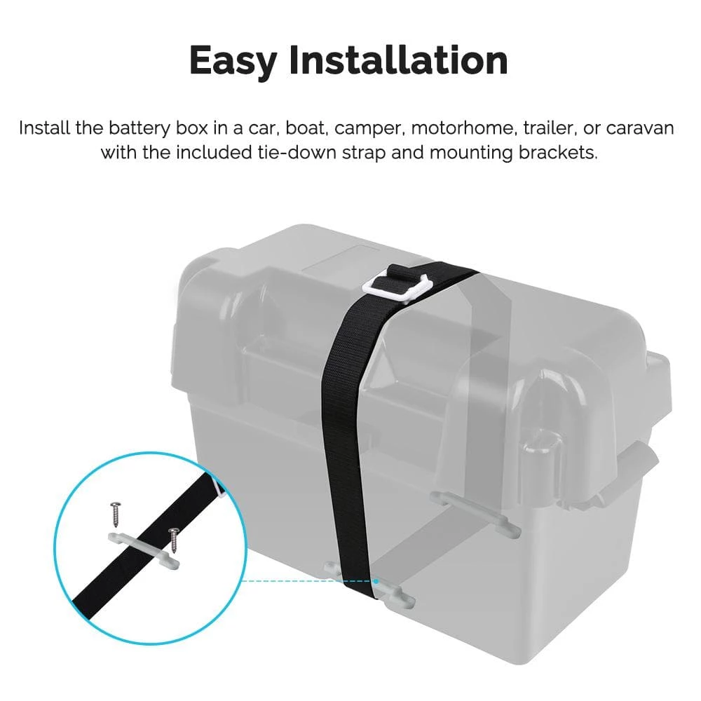- Easy installation, install the battery box in a car, boat, camper, motorhome, trailer or caravan with the included tie-down strap and mounting brackets