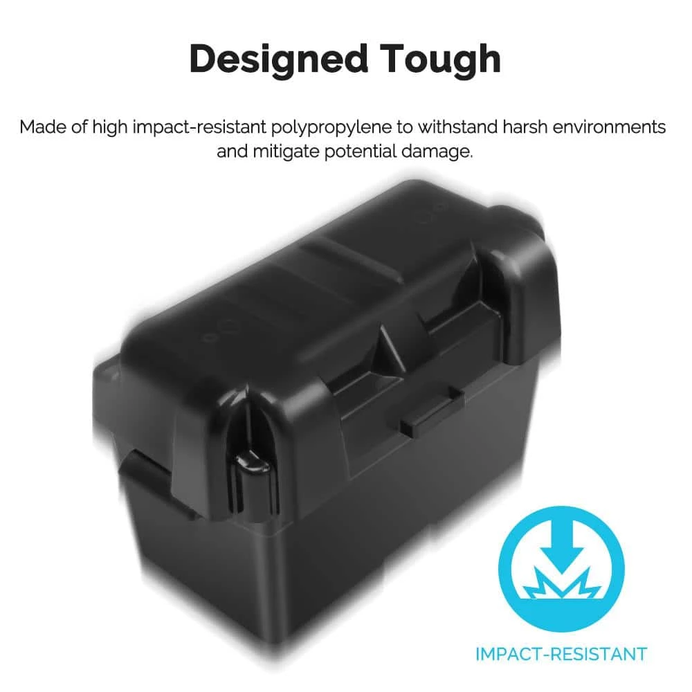 The Renogy Heavy-Duty Battery Box is the perfect battery storage solution-preventing accidental spills, limiting battery movement, as well as protecting the batteries from dust, dirt, water and other external elements that could short a battery. with the adjustable divider, the battery box is capable of accommodating most Group 24-31 batteries. This heavy-duty box uses high impact-resistant polypropylene for reliable protection while tackling rugged environments. On the top of the battery box are vent holes to allow for adequate ventilation of hydrogen gas. Thanks to the included tie-down strap and brackets, the battery box can be easily installed in a car, boat, camper, motorhome, trailer or caravan.