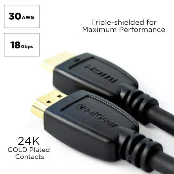 Enjoy high-quality picture and pure audio by implementing the QualGear 6 ft. HDMI Cable of 6-Pack with Ethernet in your AV setup. This all-in-one video plus audio cable features 100% Oxygen Free Copper (OFC), 30AWG thick bare copper for higher bandwidths up to 18Gbps. It features 24K Gold plated contacts for improved signal clarity. This HDMI cable is triple shielded for maximum protection from Electromagnetic Interference (EMI) and to achieve ultra-low Signal to Noise Ratio (SNR). At 6 ft. in length, this cable is flexible and convenient when making connections. It features HDMI Type A male connector on either end and plugs into any HDMI port. It works with a variety of devices, including but not limited to: Ultra HD 4K TVs, A/V receivers, Blu-ray players, cable / satellite boxes, gaming systems, Apple TV, Roku, computers and more. This cable meets HDMI 2.0 specification and is backward compatible with all previous specifications – HDMI 1.4, 1.3 and 1.0. This HDMI cable supports Ethernet and Audio Return Channels (ARC) so no separate cables are needed for Ethernet and audio return capabilities. QualGear HDMI cables are also available in 3 ft., 10 ft., 12 ft., 15 ft., 20 ft., 25 ft., 30 ft., 40 ft., 50 ft., 60 ft., 75 ft., 100 ft. lengths.