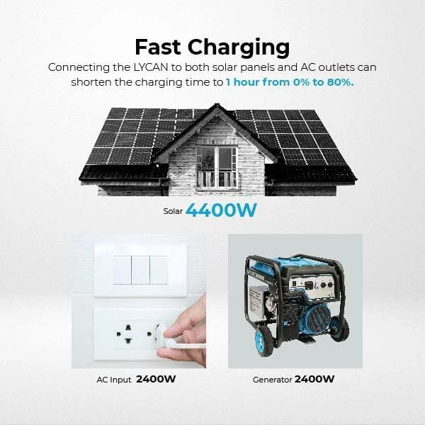 - Fast charging: the Lycan can be fully charged in 1.3-hours when connecting to both solar panels and AC outlets simultaneously
