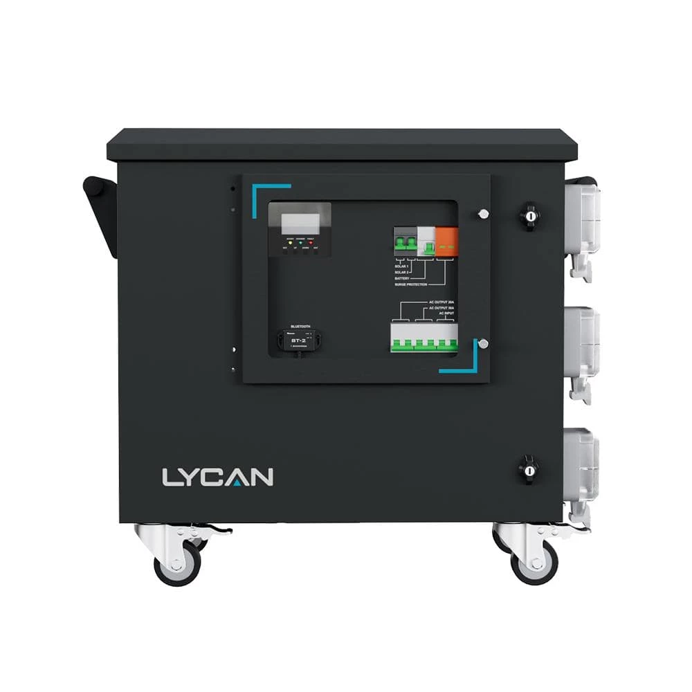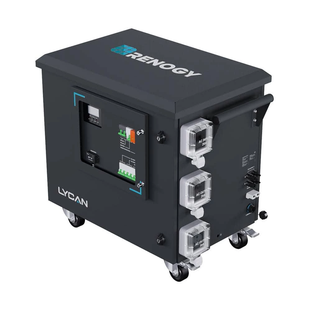The Renogy LYCAN 5000 Power Station is an all-in-one energy storage system specially designed to supply power during emergencies, power outages, or to provide power for off-grid homes with a 4.8 kWh capacity and a 3500W pure sine wave AC output, the LYCAN can deliver reliable power to most home appliances. It has a 4400W solar input capability and an intelligent maximum power point tracking (MPPT) algorithm, allowing maximized solar energy generation at any time of the day and full charge in as short as 2.5-hours. Fast AC charging, means that the LYCAN fully charges with AC power from a wall outlet or a generator in as short as 3-hours. Simultaneously connecting the LYCAN to both solar panels and AC outlets can further shorten the charging time to 1-hours from 0%-80%. The pass-through function allows the LYCAN to bypass AC power to run home appliances while keeping its batteries topped off. Thanks to the pre-wired design and plug-n-play connectors, the LYCAN can be easily integrated into existing electric power systems, greatly reducing installation time and labor cost. The built-in circuit breakers protect the LYCAN from damage caused by unexpected system faults. Equipped with a Bluetooth module, the LYCAN provides access to real-time monitoring on the Renogy DC Home app. It can also be easily expanded to up to 19.2 KWh with Renogy 48V to 50 Amp Smart Lithium Iron Phosphate Batteries, covering any applications from short term blackout protection to long term off-grid living.