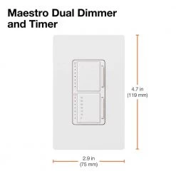 Replace a switch with the combination Maestro dimmer switch and timer control, and get the added benefits of two controls without taking up the extra space on your wall. The Maestro dimmer switch packs multiple features into a single control such as a delayed fade to off, which gives you time to exit a room by slowly fading the light off. The soft glowing lights on the side of the dimmer switch show the preset lighting control and also serve as an indicator light in a dark room. The Maestro Timer portion of this control helps you save money and energy by automatically turning off the lights and fans after a preset time. Use the tap switch to turn the timer on and off, and use the rocker on the side to set the timer to the desired time-out option, anywhere from 5-60 minutes. Softly lit orange lights indicate the time remaining before turn-off. The Maestro dimmer switch and timer control is great for bathrooms, using the dimmer on the vanity lights, and the timer on the exhaust fan. Using a timer on exhaust fans helps to reduce moisture, mold, and mildew growth in bathrooms. For a clean, neat look use the combination Maestro dimmer switch and timer control, and save both money and energy. Coordinating Claro wallplates purchased separately.