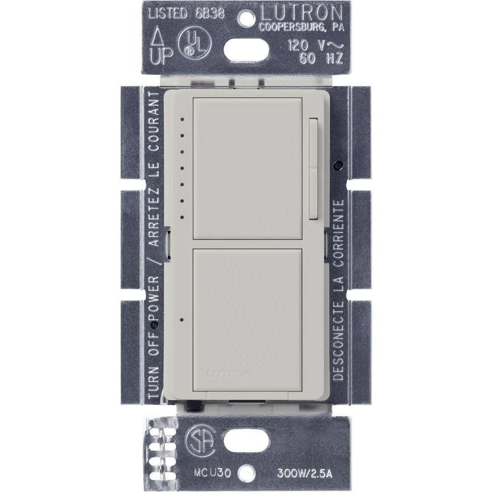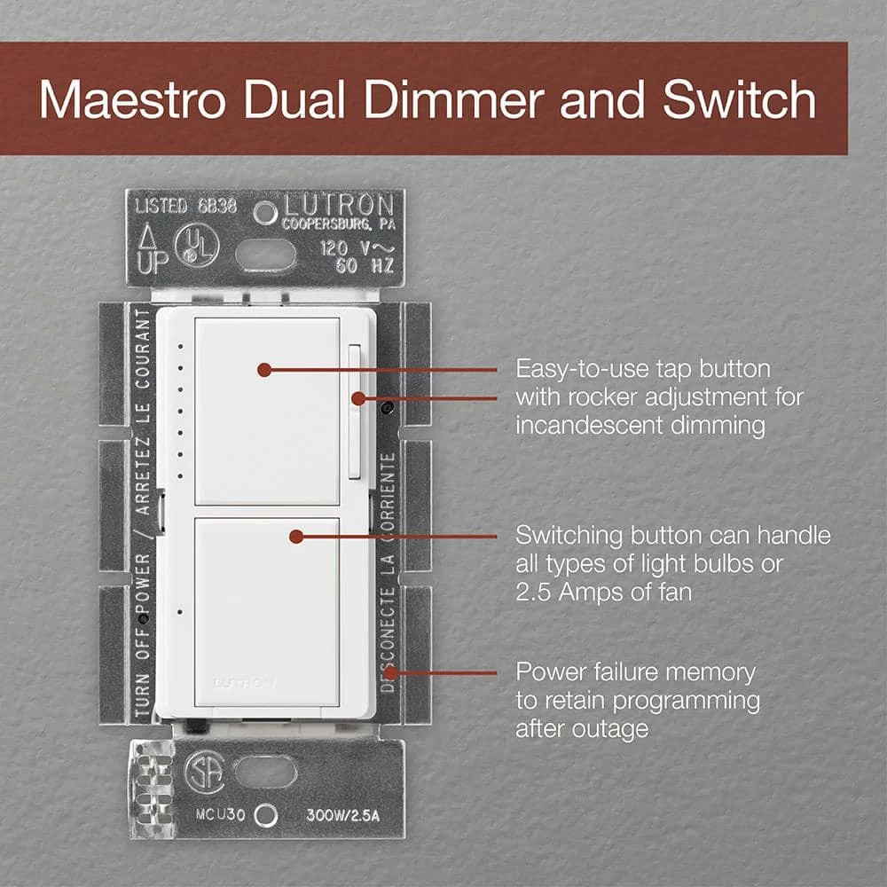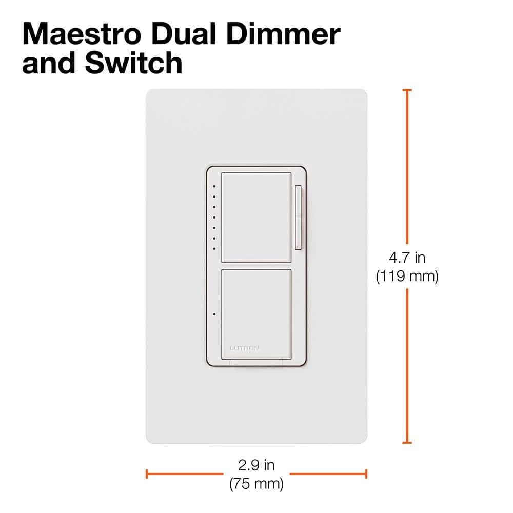 The Maestro dual dimmer and switch is a combination control that incorporates both a single-pole switch at the bottom, as well as a dimmer on top. This dual control allows you to turn one light source on and off with the bottom switch, while adjusting the lighting level of another source with the top dimmer. The Maestro Dual Dimmer/Switch is a great replacement for stacked switches commonly found in kitchens and bathrooms. It combines the function of 2 controls in 1, but is still packed with all of Maestro’s smart features. The easy-to-operate top tap switch turns lights on/off to your favorite light level or taps twice for full on. Press, hold and release the switch for delayed fade-to-off. Delayed fade-to-off gives you 10-60 seconds to leave the room or get into bed before the lights go out. Adjust the light level for any activity using the rocker. No neutral wire required. The dimmer works with incandescent/ halogen bulbs, while the switch works with any light bulb or general purpose fan(s). Coordinating Claro wall plate sold separately.