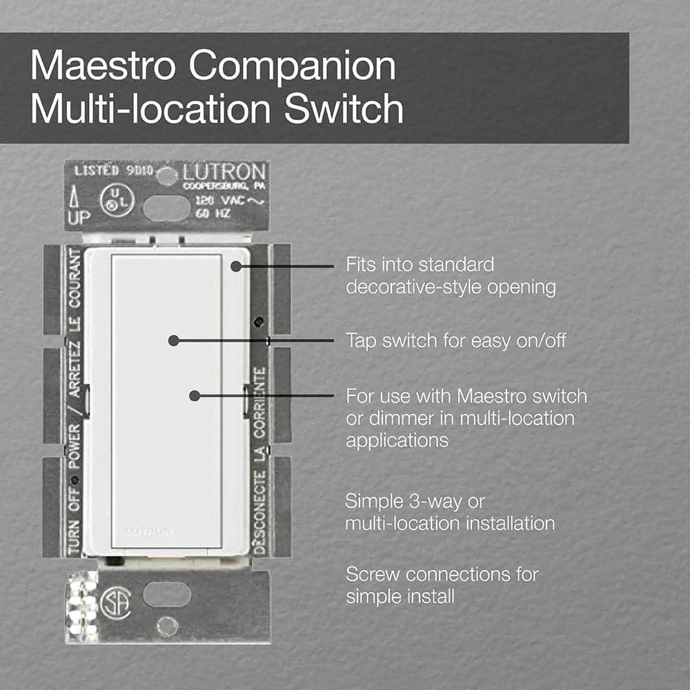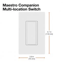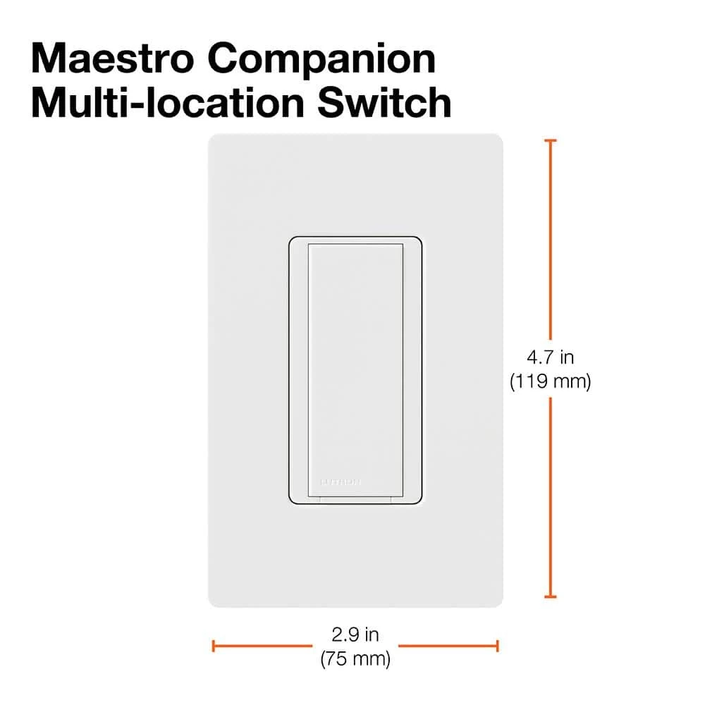 The Maestro companion switch is designed to complement a Maestro switch. The easy-to-operate tap switch turns lights on and off. Up to 9 companion switches can be linked to a Maestro switch, for a total of 10 areas of control. Maestro accessories provide light control convenience for hallways, stairways or any room with multiple switch controls. Coordinating Claro wall plate sold separately.