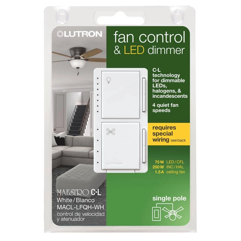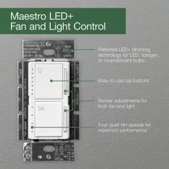The NEW Maestro 4-speed fan control and LED dimmer helps you achieve the ideal comfort level for your home. This Maestro device allows you to dim your LED lights and adjust your fan speed all from one wall control, eliminating the inconvenience of pull chains! This product works with up to 75W of dimmable LEDs or CFLs or up to 250W of Incandescent or Halogen bulbs; fan control works with up to 1.5A ceiling paddle fan.