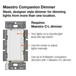 For Use with Maestro Multi-Location dimmer switches only. Dimmed lights can help create a romantic mood or a casual atmosphere for family meals. Turn the lights up for bright lighting during preparation and cleanup. Companion dimmer switches allow you to dim from either end of a hallway. Use up to nine companion dimmers with only one Maestro Multi-Location dimmer switch. Coordinating Claro wall plates and accessories sold separately.