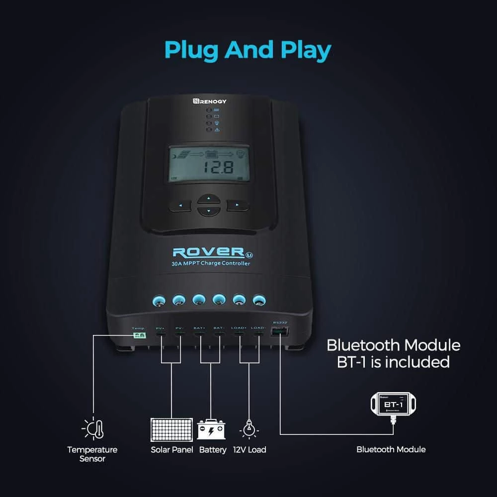 Meet the newest addition to the Renogy Rover Series, the 30 Amp Rover-Li MPPT Charge Controller. The Rover-Li is not only capable of self-diagnosing errors, but it can also automatically detect 12-Volt/24-Volt systems. Pair this MPPT charge controller with the battery of your choice, from sealed to lithium. This 30 Amp charge controller is encapsulated with a sturdy case that protects against general wear and tear. It also includes an aluminum heat sink for heat dissipation. Compatible with the Renogy BT-1 Bluetooth Module, users can connect to and monitor their solar power systems in real time, straight from their phones.