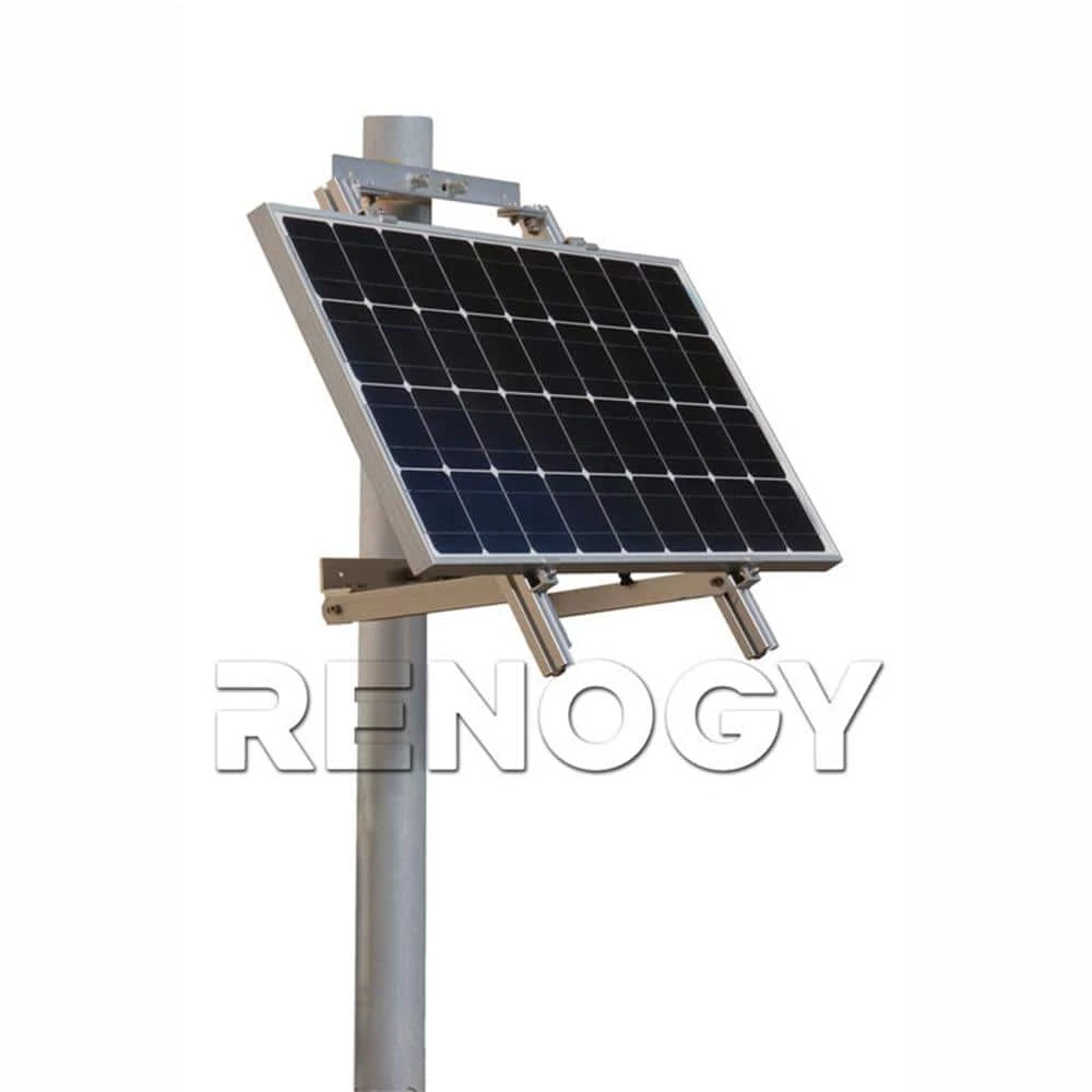 The pole mount is designed for off-grid applications, when mounting to a roof is not ideal. Recommended Tools (Not Provided): Socket Wrench, Torque extension, Box-Leveler, Tape measure, 18 mm wrench or socket for larger hex nut, 13 mm wrench or socket for smaller hex nut Notice: This equipment should be installed, adjusted, and serviced by qualified electrical maintenance personnel familiar with the construction and operation of the equipment and the hazards involved. Failure to observe this precaution may result in bodily injury. Protective gloves and safety glasses should be worn during installation. Do not attach solar panel to pole mount until mount is securely fit, and pole base has been secured. Chance to strip nuts and bolts exists. Multiple people for installation are suggested. Please Note: This product is only compatible with Renogy 50-Watt and Renogy 100-Watt solar panels. Please Note: Pole not included. Pole diameter necessary to work with mounts: 4 in.
