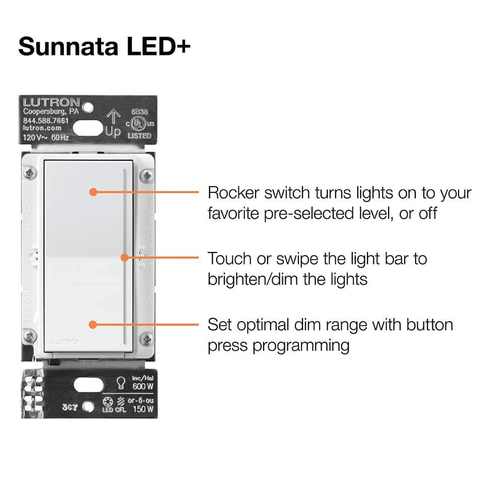 Introducing the new Sunnata touch dimmer switch with LED+ Technology. This decorator-style dimmer switch features a rocker to turn lights On/Off and a sleek touch bar to dim/brighten your lights. No Neutral Required. Wall plate sold separately.
